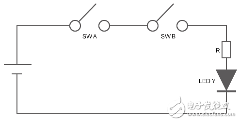 让我们仔细看一看AND电路的工作方式。如果用开关和LED来表现AND电路的线所示的串联电路。