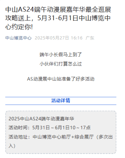 通过检索关键词记者发现,微信公众号“中山博览中心”在5月27日曾发文介绍,“2025中山AS24端午动漫嘉年华”于5月31日至6月1日10点-17点在中山博览中心前厅+综合展厅举行。同时,该文章多处均写有客服咨询、服装道具咨询、商摊咨询等联系方式。